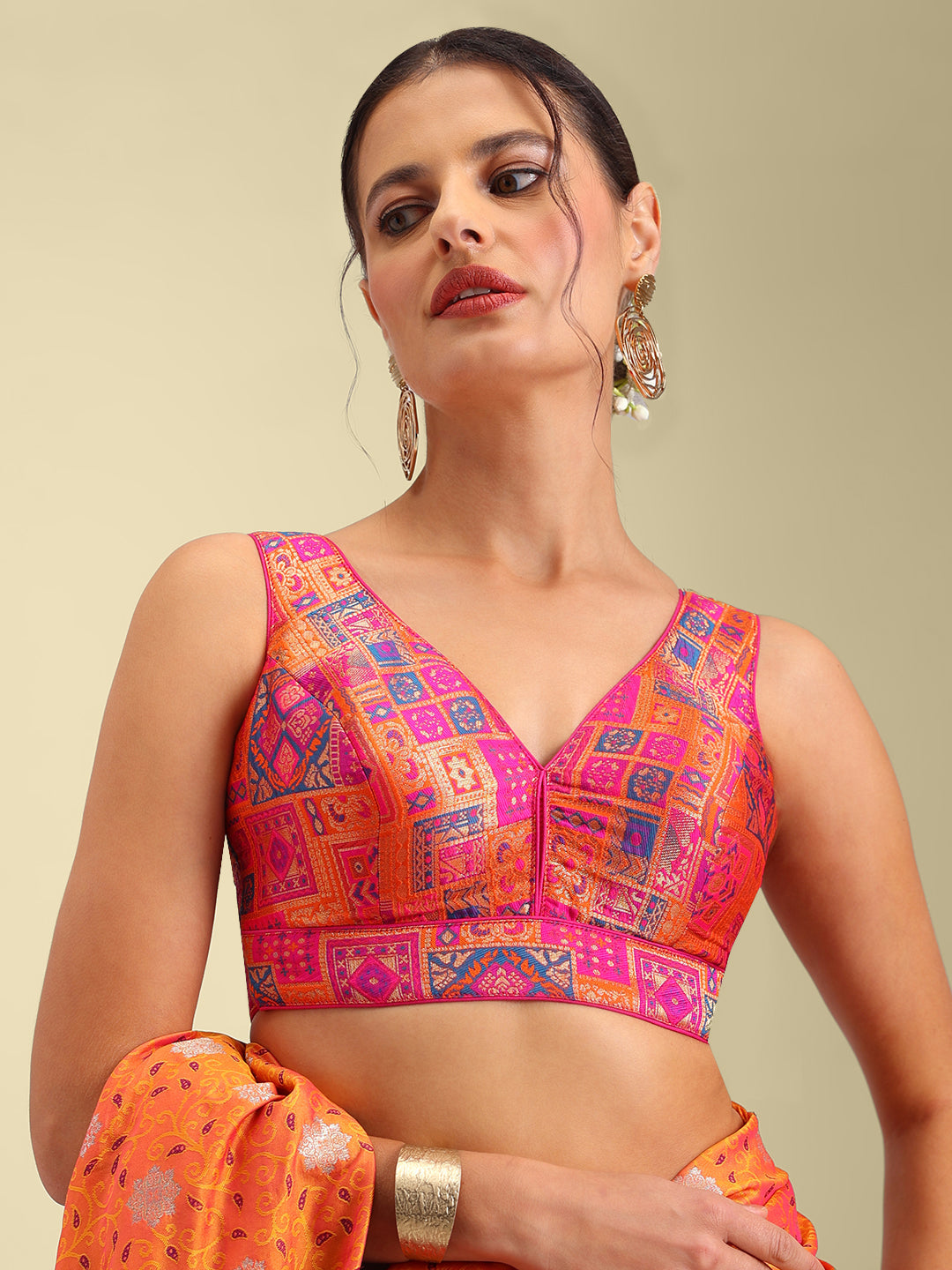 Women's designer padded saree blouse with V-neck sleeveless back open hook and eye closure