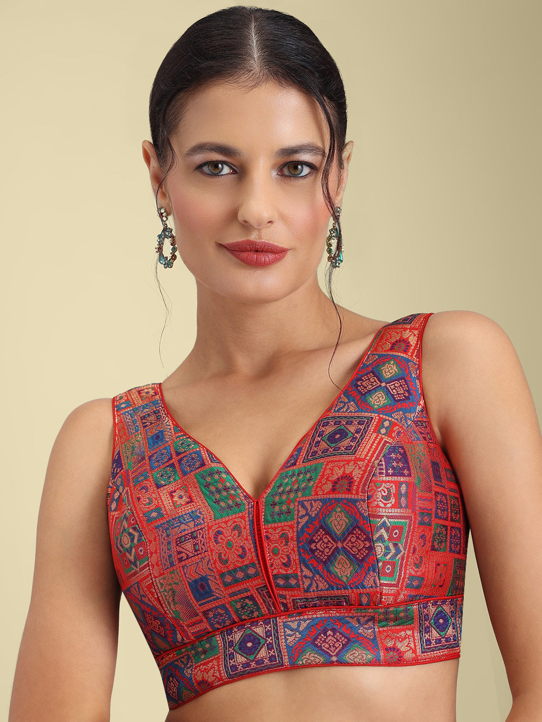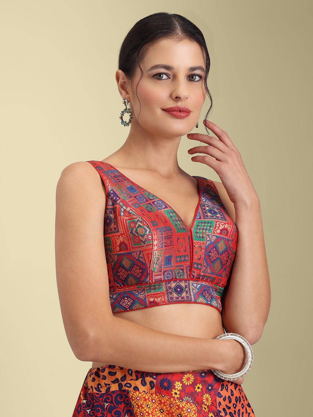 Women's designer padded saree blouse with V-neck sleeveless back open hook and eye closure
