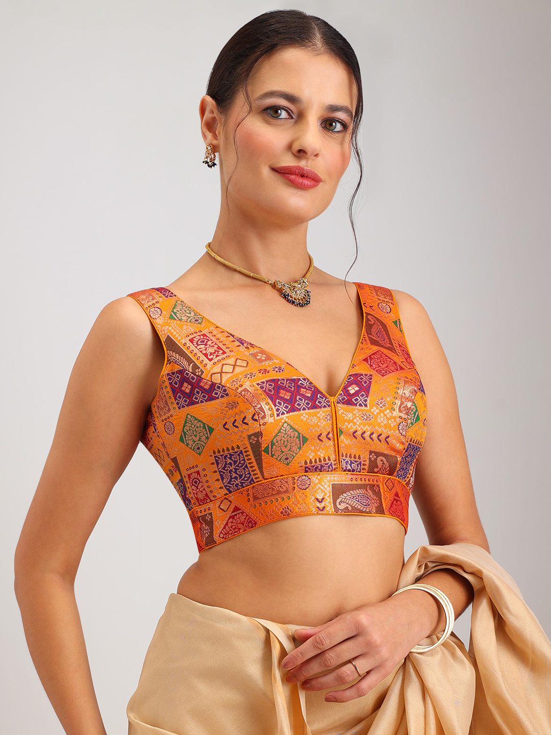 Designer printed brocade padded blouse with sleeveless v neck back open hook and eye closure