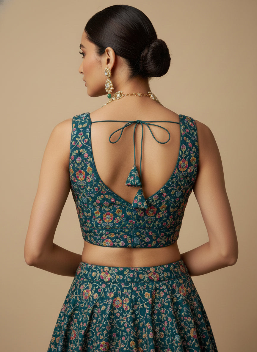 Women's teal embroidered V neck blouse with back open hook and eye closure