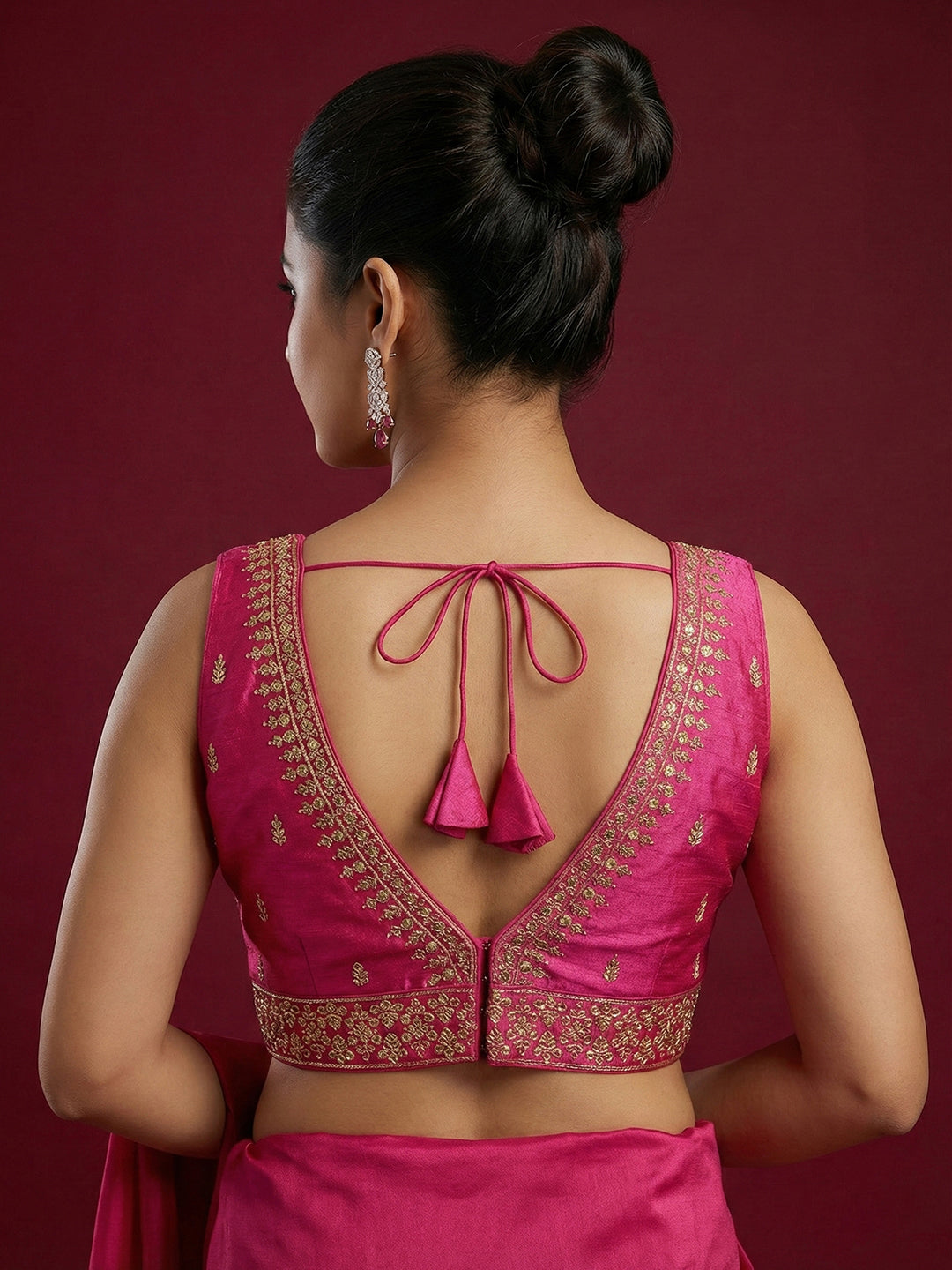 Silk embroidered padded saree blouse with v neck sleeveless back open hook and eye closure
