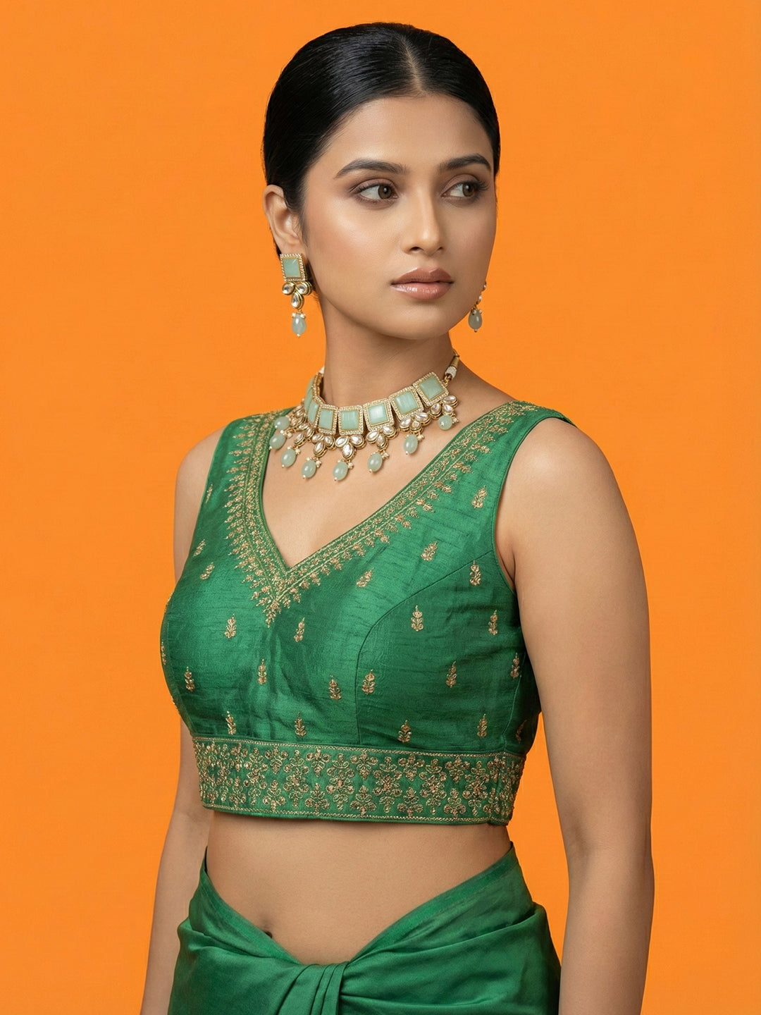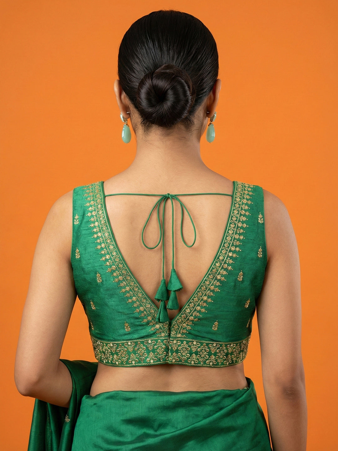 Silk embroidered padded saree blouse with v neck sleeveless back open hook and eye closure