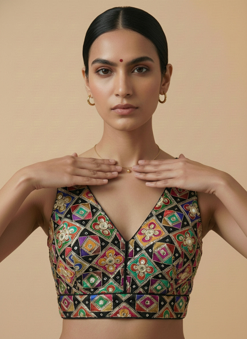 V neck sleeveless padded blouse multi coloured designer piece with fancy back pattern hook and eye closure