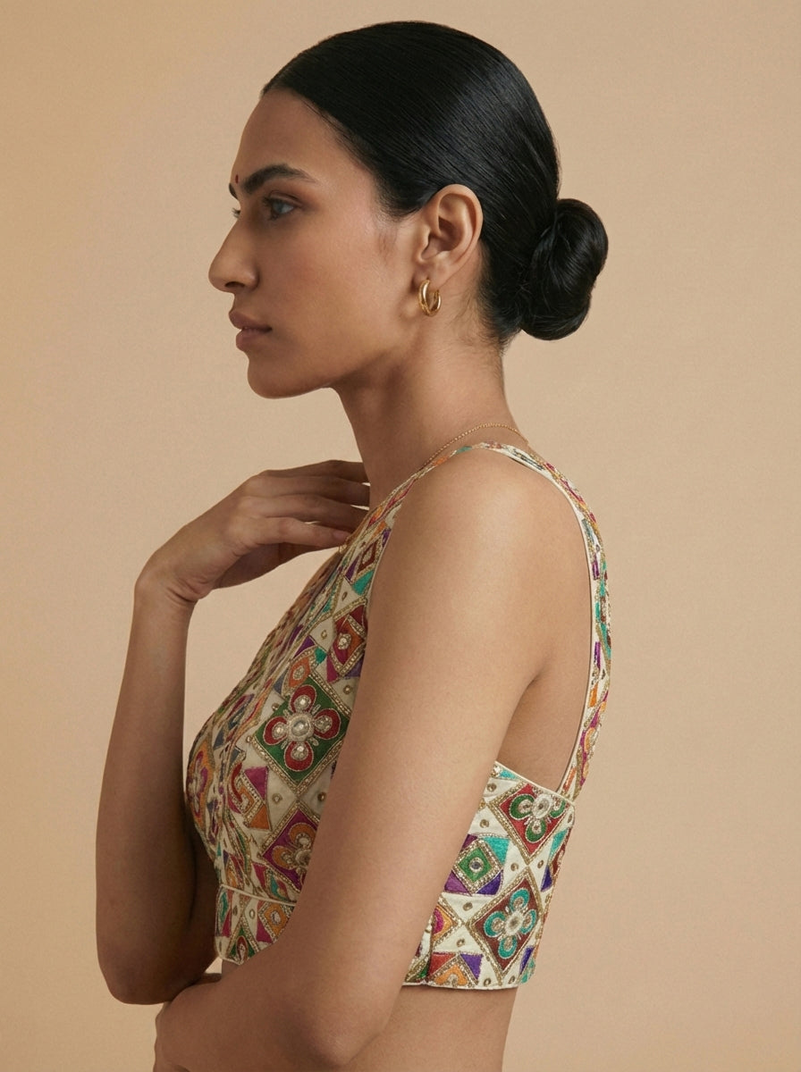 V neck sleeveless padded blouse multi coloured designer piece with fancy back pattern hook and eye closure