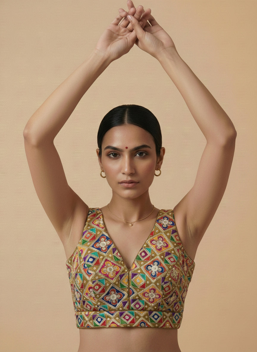 V neck sleeveless padded blouse multi coloured designer piece with fancy back pattern hook and eye closure