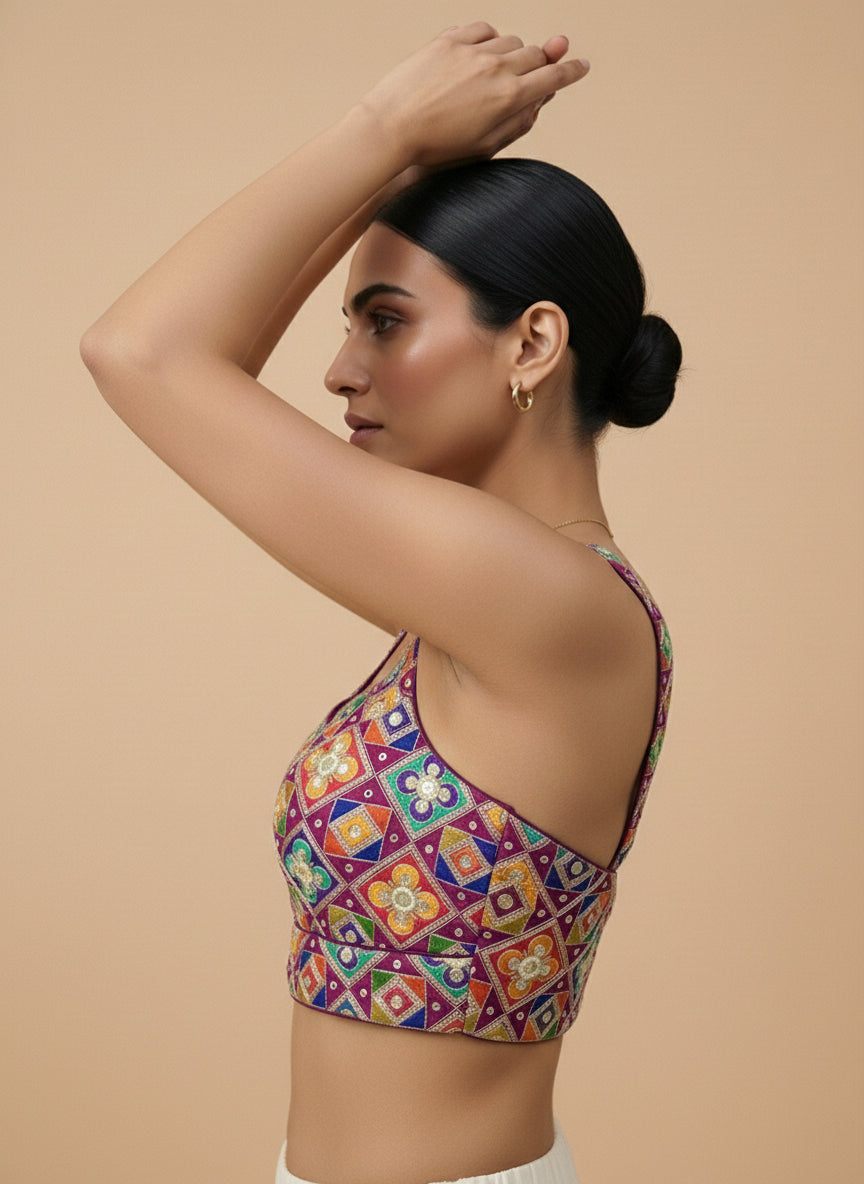 V neck sleeveless padded blouse multi coloured designer piece with fancy back pattern hook and eye closure