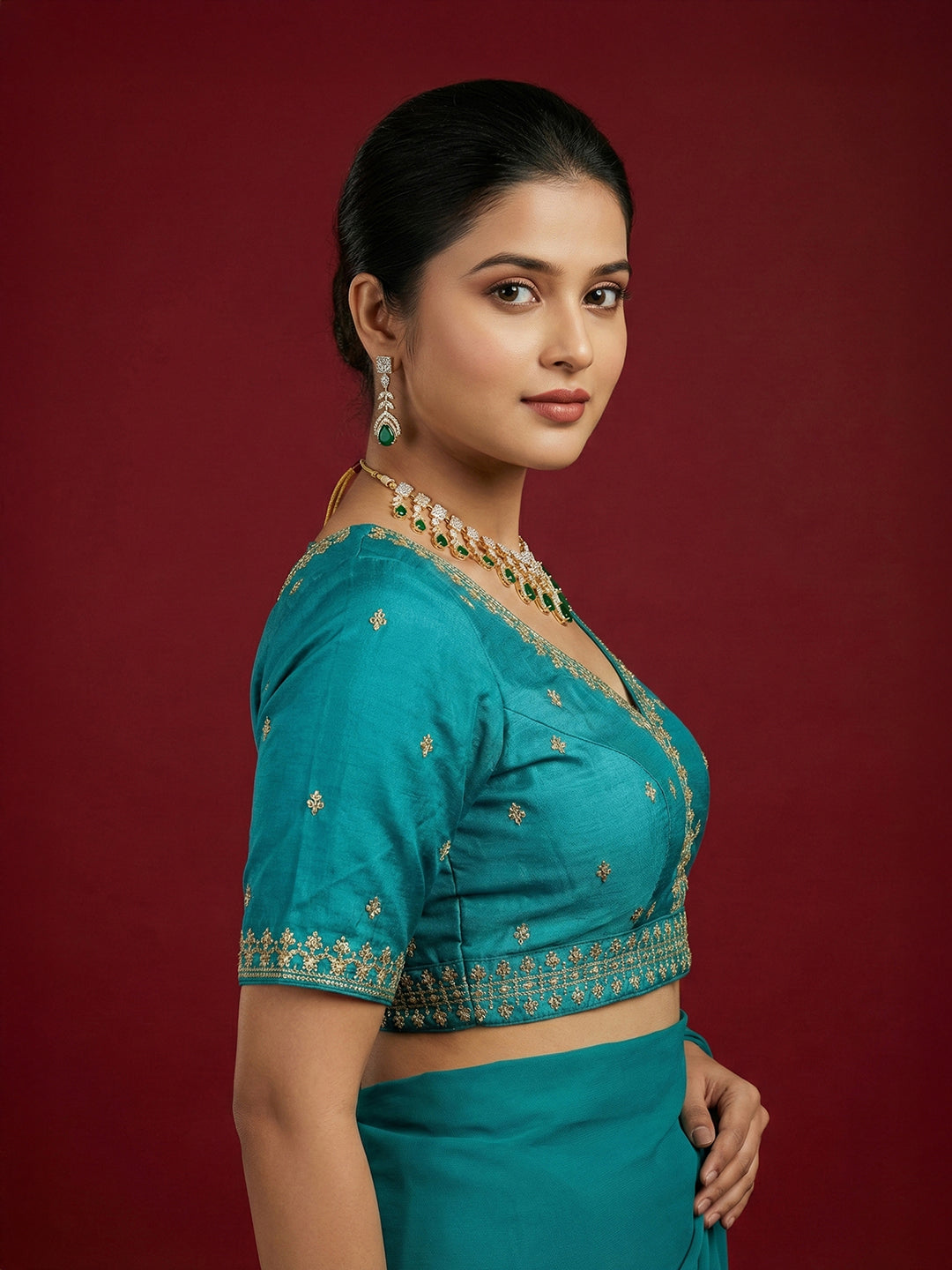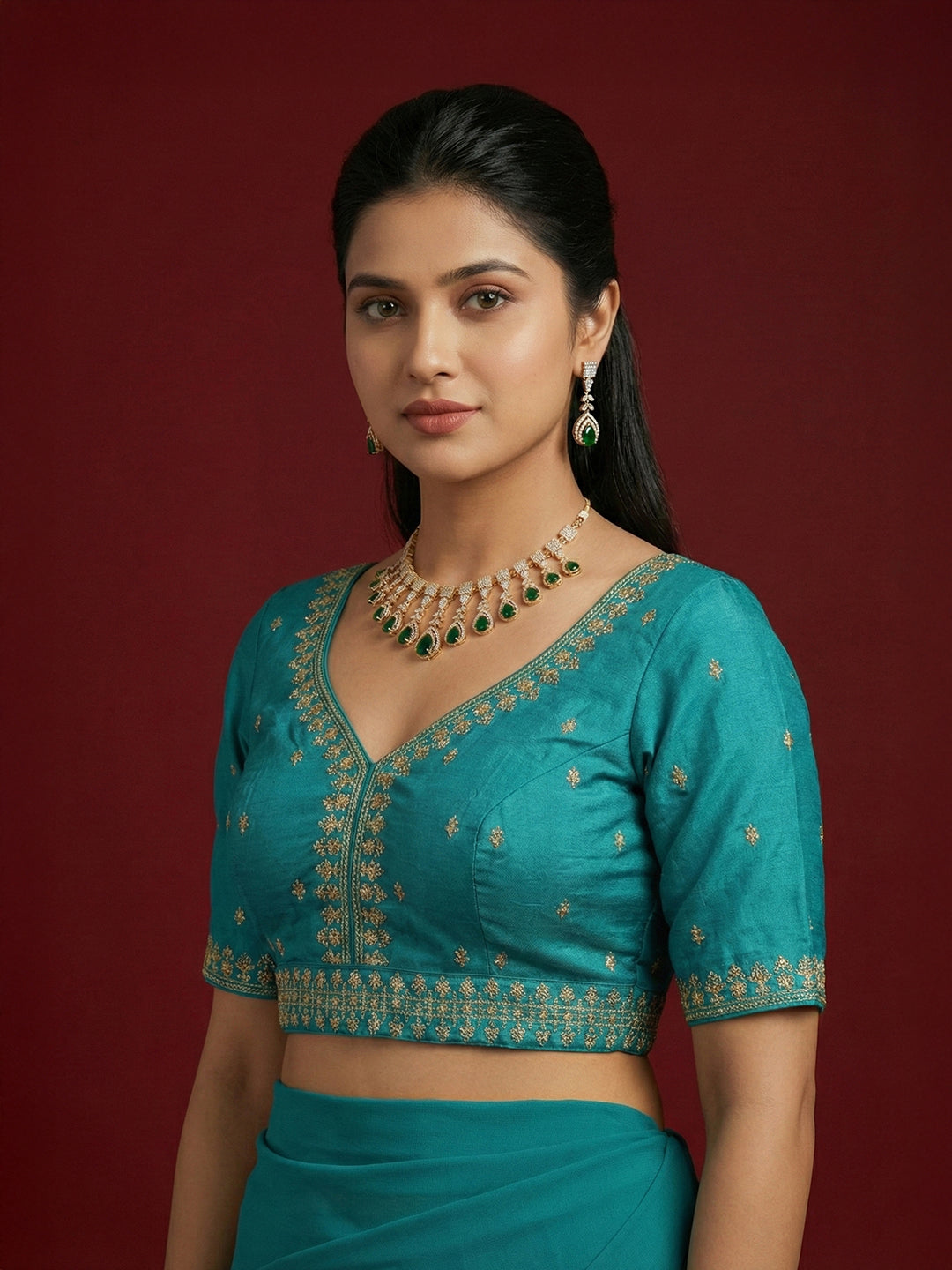 V neck capri silk embroidered padded saree blouse with back open hook and eye closure